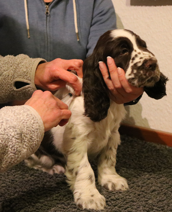 Wir haben fertig. Die heutigen Bilder zeigen oben das gestrige Impfen von Scotty und unten die Chipkontrolle von Ylvi durch die Zuchtwartin heute Vormittag.