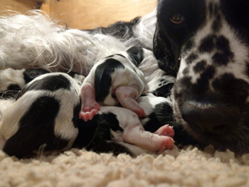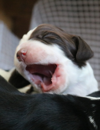 Der letzte lebendgeborene Welpe ist ein schwarz-weisser Rüde mit Lohfärbung. Auch seine Blesse ist nicht ganz symmetrisch, und geht minimal über das linke Auge. Er kam um 5:49 Uhr an und wog 268g. Ein Welpe war noch fühlbar in Sallys Bauch und oft hat man vor dem letzten Welpen doch noch eine längere Pause. So auch diesmal, und Sally fing erst eine halbe Stunde nach Nr 9 wieder mit den Bauchpressen an. Mit großen Abständen zwischen den Pressen ging zunächst ein Reiningungsprozess vor sich und um ca 07.00 Uhr kam eine tote schwarz-weisse Hündin, zwar normal ausgebildet aber deutlich dehydriert. Alle Belebungsversuche blieben erfolglos.