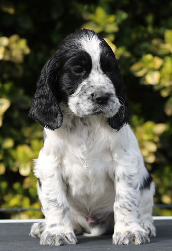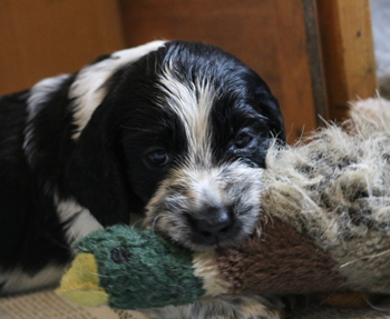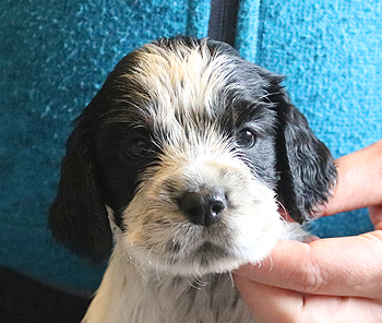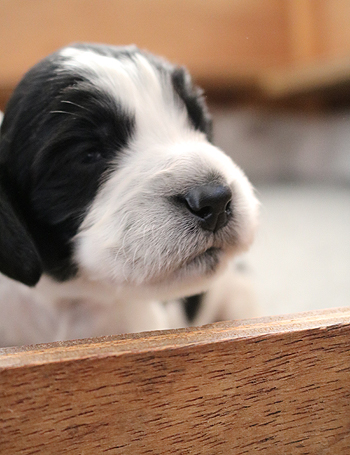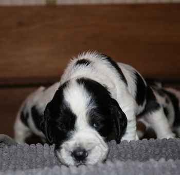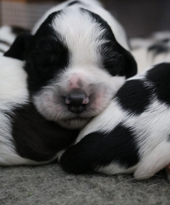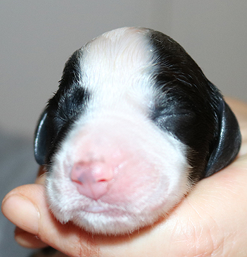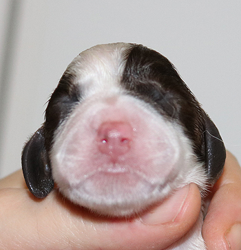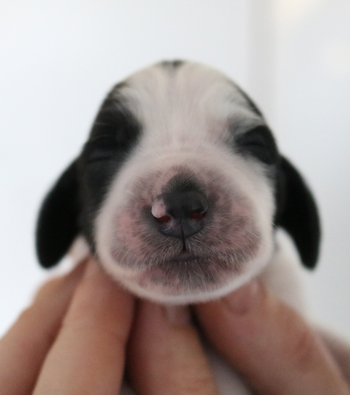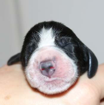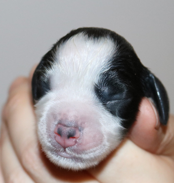 mit dem letzten Zwillingspärchen. Um 5:17 Uhr landete ein schwarz-weisser 272g schwerer schwarz-weisser Rüde in der Wurfkiste. Auch er hat eine breite Blesse, eventuell ein wenig asymmetrischer als seine Schwestern. Seine linke Körperseite ist durchgefärbt schwarz, die rechte Seite ist fleckig.