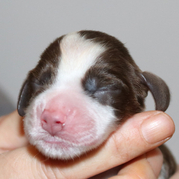 Welpe Nr 5, ein weiterer braun-weisser Rüde, folgte auf dem Fuße um 4:05 Uhr. Sein Erkennungsmerkmal ist, dass die Rute nicht durchgefärbt ist, sondern nur einen Fleck am Ansatz hat. Er brachte 276g auf die Waage. Ob auch er Loh gefärbt ist ist zu diesem Zeitpunkt schwer zu sagen. Unter der Rute sieht man nichts (das ist sonst der deutlichste Hinweis auf Lohfärbung in diesem Alter) denn da ist ja weisses Haar.