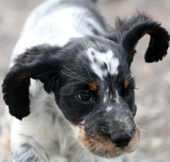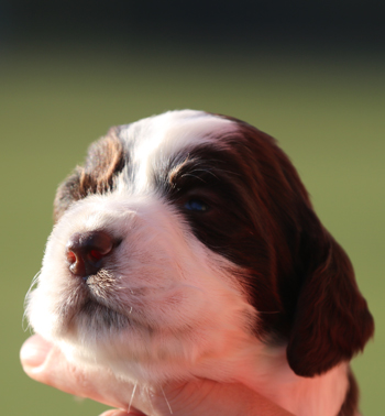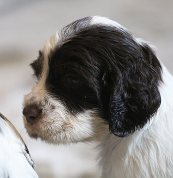 Um mich vom unpleasant event zu erholen und nicht im Tagebuch wüst herumzuschimpfen, habe ich ein wenig Zeit gebraucht. Trinity ist seit Mittwoch Abend aufgrund eines (Zitat) "unpleasant events" wieder frei für die richtige Familie. Anstatt mich weiter über unzuverlässige Menschen zu ärgern, (eine Mitschuld trifft auch mich, da ich auch nach 16 Jahren Hundezucht weder "Reservierungsgebühr" noch "Anzahlung" verlange) erzähle ich vielleicht lieber etwas über Welpe 2 Sporty Springers Trinity. Auch wenn sie auf den Bildern oft einen mürrischen Gesichtsausdruck und bad hair day hat (ihrer Züchterin in Sachen Fotogenität also das Wasser reichen kann) ist sie ein aufgeweckter kleiner Sonnenschein. Sie ist eine offene, mutige, aktive Hündin, die als Erste verstanden hat auf meinen Schoß zu klettern in der dritten Lebenswoche. Schmusen steht wie Spielen hoch im Kurs bei ihr. Bei den Ausflügen orientiert sie sich schön an den Füßen des Begleitmenschen und geht nicht ihrer eigenen Wege. Sie wird ihren neuen Leuten, die sich gerne jetzt melden dürfen, viel Freude machen.