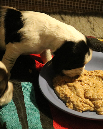 Mit nun drei festen Tagesmahlzeiten neben Sallys Milch arbeiten wir weiter ganz feste am Gewicht der Welpen.