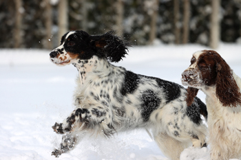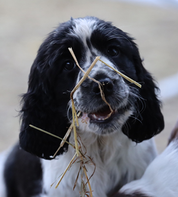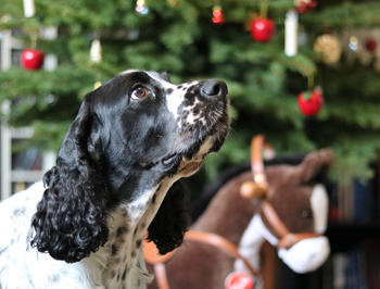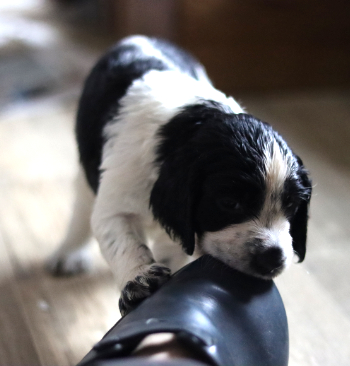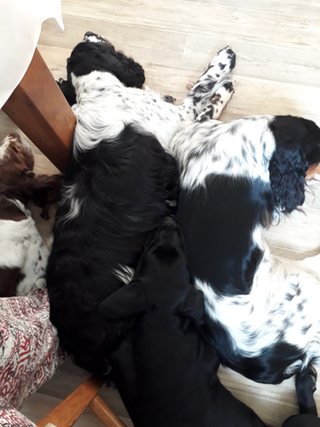 Zurück zum heutigen Bild: die beiden Youngster halten uns schon gut in Atem. Haze´s neuester Einfall ist Klorolle abwickeln. Das ist mir in 25 Jahren mit Springer Welpen noch nie passiert. Ausserdem zahnt sie jetzt, und kein Spielzeug unserer Schnullertrulla ist vor ihr sicher. Da lässt sich Tia auch gerne von ihr anstiften, allerdings ist Tias größtes Verbrechen auf Tisch oder Anrichte befindliche Lebensmittel stehlen. Ein Plätzchenteller kann hier nicht auf dem Tisch stehen wenn kein erwachsener Zweibeiner im Raum ist. Aber wir sind ja Kummer gewohnt was das angeht. Cinco war immer der grösste aller Diebe.