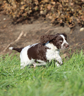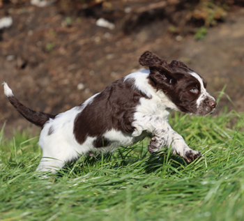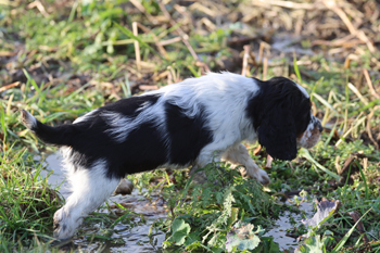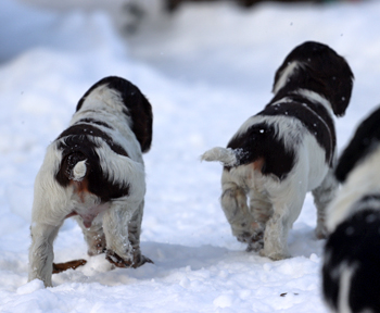 Diesmal ist uns das Wetter hold, die Zwerge verbringen nun auch viel Zeit unten. Das ist auch bitter nötig, denn wenn man morgens die Tür zum Welpenraum öffnet, fliegen einem nicht nur die Ohren weg, nein man bekommt Tränen in den Augen von dem Chaos, dass 8 kleine niedliche Springer innerhalb einer Nacht veranstalten. Darum ist es gut, dass man die V-ichtel nun sogar schon zum Frühstück an die Luft setzen kann, dann hat man oben wirklich freie Bahn für den sehr sehr nötigen Großputz.
