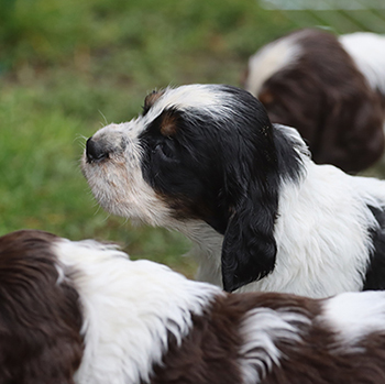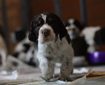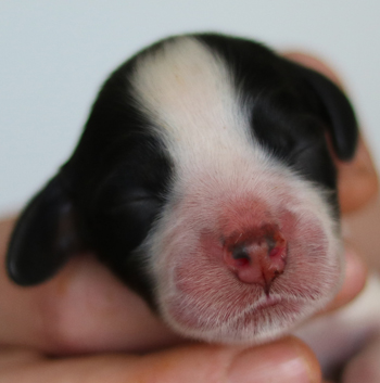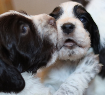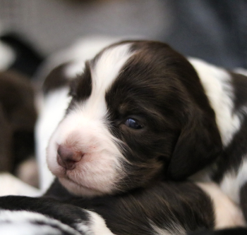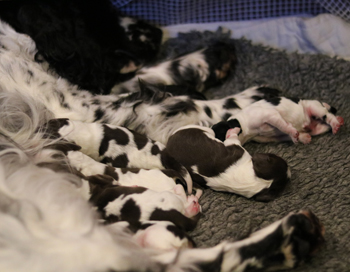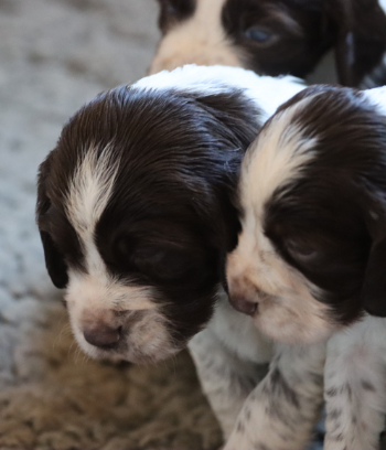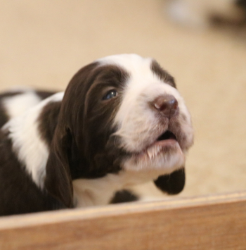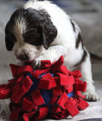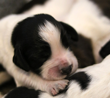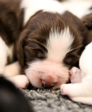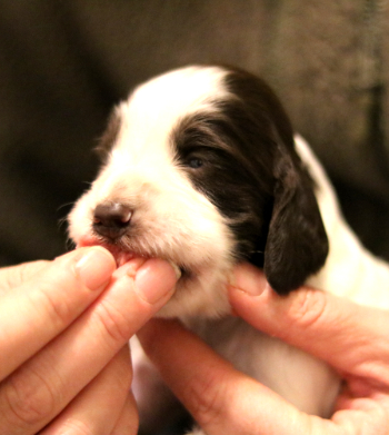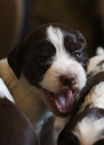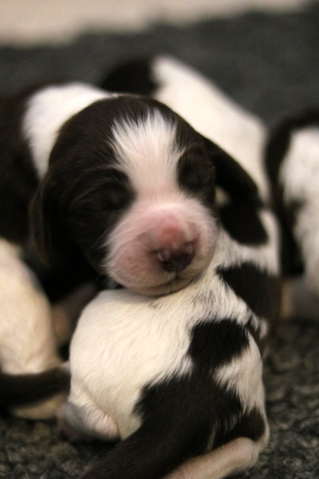 Den V-ichteln geht es super, drei Mahlzeiten gibt es mittlerweile über den Tag verteilt, zusätzlich zu Mamas Milchbar. Der Welpenauslauf ist jetzt tagsüber geöffnet und die Zwerge können ihn erkunden. Nachts ist die Wurfkistentür allerdings geschlossen, damit niemand sich verläuft. Die Springerkinder können jetzt zueinander Kontakt aufnehmen, Ansätze von Spielverhalten und Kommunikation sind erkennbar. Auch zu mir nehmen sie Kontakt auf und erklettern meinen Schoß wenn ich im Schneidersitz im Welpenauslauf sitze. Diese Woche ist meine liebste Woche der Welpenentwicklung wir lernen uns kennen.