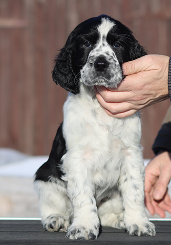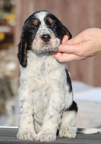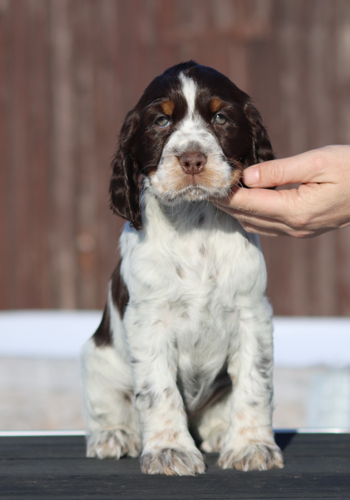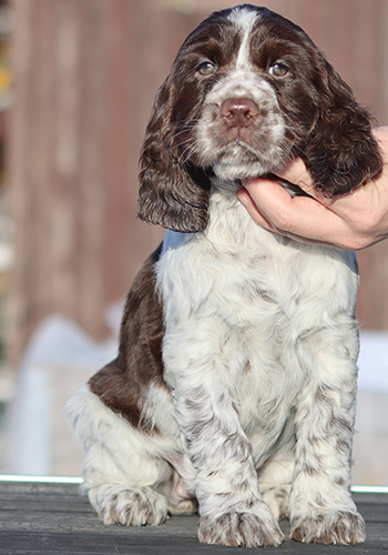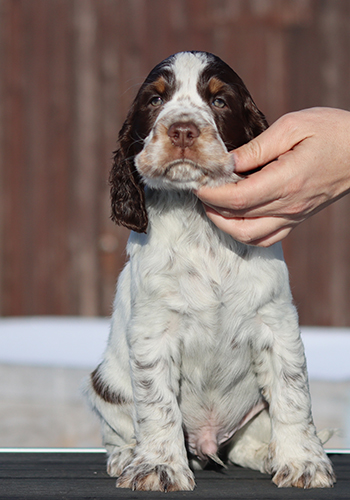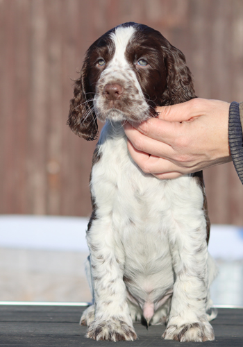 ein in sich stimmiger Rüde von eher elegantem Typ, mit sehr guten Proportionen, tiefer Brust und guten Winkelungen. Seine Augenfarbe könnte etwas dunkler sein. Sein Haar ist von der Qualität die ich mir wünsche, so dass es wenig Pflegeaufwand benötigt. Sonic wird braun-weisse Fellfarbe vererben und trägt auch das Gen für die Loh-Färbung.