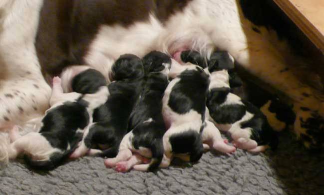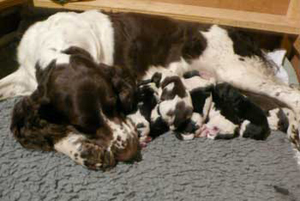 Der Zeitpunkt zum "Countdown" ist jetzt gekommen. Ich werde natürlich immer unruhiger während Joy immer ruhiger wird- so gleichen sich unsere Gemüter aus. Die Wurfkiste steht auch bereits neben dem Bett und Joy nutzt die darinliegende Welpenwäsche zum Scharren-üben (nicht, dass sie das nicht zur Perfektion beherrscht) Das Training fürs Scharren begann heute morgen um sechs und beendete meinen Nachtschlaf. Naja, im Bett ist es zur Zeit sowieso zu eng mit (geschätzten) 8 Springern und zwei Zweibeinern :-) Irgendwie scheint bei dieser Trächtigkeit alles schneller zu gehen als beim B-Wurf: Joy hält bereits Milch vor für die Ankunft der Babies und ich neige dazu mir einige Tage früher frei zu nehmen. Vielleicht ist da aber auch nur der Wunsch Vater des Gedanken, und Joy wird genauso pünktlich sein, wie vor zwei Jahren. Lassen wir uns überraschen! Wetten werde ich in der Beziehung jedenfalls nicht mehr... :-) |