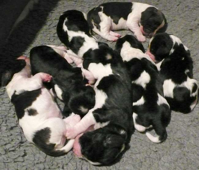 Alle zusammen am Tag nach der Geburt : ganz links die schwarze Hündin Nr.7 direkt daneben Rüde Nr 4 "der Lütte". Im Anschluß seine drei Brüder, fast ganz rechts die braune Hündin Nr 5 und im Schatten an Joys Pfote zu erahnen Hündin Nr 2 b/W |