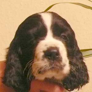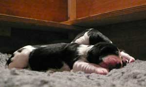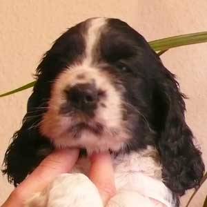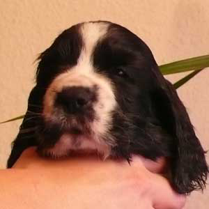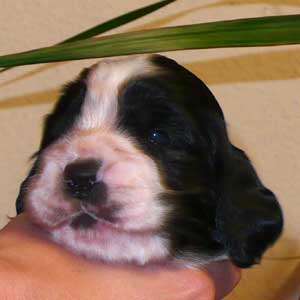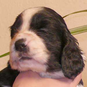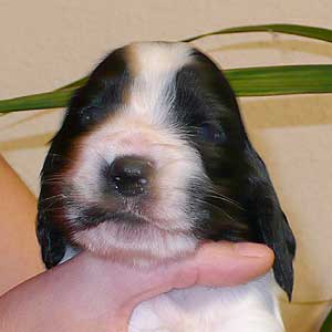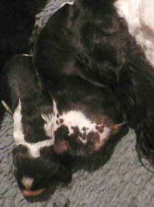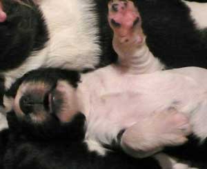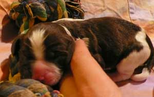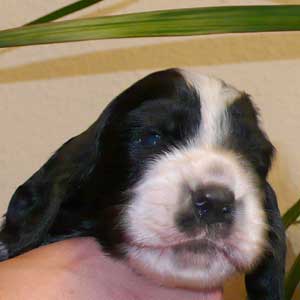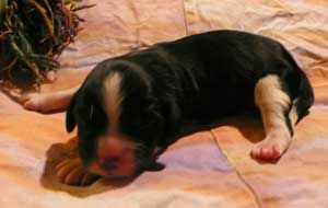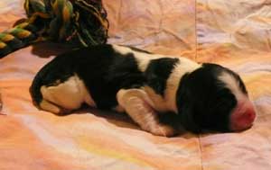 um 01.10 Uhr ein Welpe (Nr 7) in intakter Fruchthülle mit seiner eigenen und der fehlenden Nachgeburt im Schlepptau entgegen. Auf den ersten Blick zu sehen ist, die Farbe: schwarz! zur Geschlechterkontrolle müssen wir das Auspacken, Abnabeln, Lecken und den ersten Schrei abwarten. Was für ein Glück- zum guten Schluß : die schwarze Hündin. Sie hat eine schmale asymmetrische Blesse einen langen blitzförmigen weißen Fleck auf dem Rücken und einen weißen Kragen. Mit 350g ist sie die schwerste der Hündinnen.