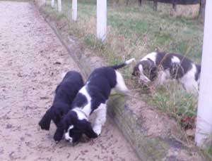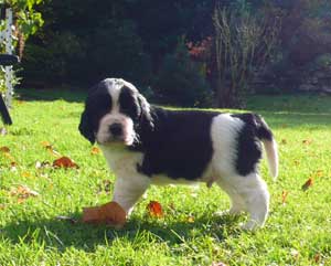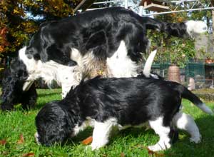 Meine verbliebenen drei Musketiere und ich geniessen die Zeit die wir noch gemeinsam haben. Am Morgen vor der Arbeit ist Spielstunde en famille angesagt. Mama Joy, Oma Nova und Undis bringen gemeinsam mit mir die Bande in den Tag. Am Vormittag gibt es einen Betreuerwechsel und Halbschwester Fine tollt ausgelassen mit ihnen durch den Garten. Am Nachmittag steht ein Spaziergang gemeinsam mit Undis an und auf dem Rückweg finden wir natürlich "rein zufällig" noch ein paar verstreute Leckerchen im Laub. Das Suchen macht Spanielnasen müde. Danach ist wieder eine laaaaange Spielphase mit Versteckspiel unter dem Bett und Fangenspiel mit Mama. Auch die Katze hat nun keine Ruhe mehr auf ihrem Schlafzimmerplatz. Den Drang der C-chen auf Dingen herumzukauen besänftige ich am Abend mit klein geschnittenen Kaustreifen. Damit kann man sich schon prima für zwanzig Minuten beschäftigen. Täglich trudeln e-mails oder Telefonate der restlichen C-chen ein. Camaros Besitzerin Trix hat sogar ein Tagebuch ins Netz gestellt in dem man die vielen Dinge die Camaro jetzt lernen muß verfolgen kann. Auch Kiwi hat ein eigenes kleines Tagebuch. Also werden uns die C-chen weiter unterhalten, auch wenn dieses Welpen-Tagebuch in naher Zukunft geschlossen wird |