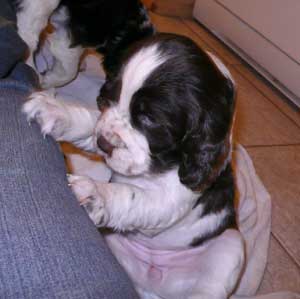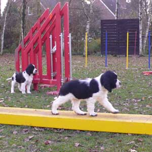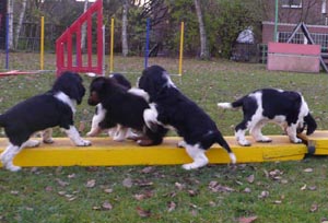 Ein ereignisreiches Wochenende liegt hinter uns. Cobain und Crazy begleiteten uns zu ihrem zweiten Agilityturnier. Dort war viel Zeit und Raum mit Schwester Kiwi zu spielen und auch andere Hunde kennenzulernen. Wieder konnten sich viele Hundler für die süßen Springergesichter erwärmen und unsere Bande mußte bei jedem Gang hinaus mehrere Begrüßungspausen einlegen. Da ich bei bereits seit Samstagmorgen nur noch für Cobain verantwortlich war, startete direkt sein Stubenreintraining unter meiner Aufsicht. Crazy konnte sich schon am Samstag an Gil gewöhnen (oder doch andersherum?) und war auf Anhieb Sandras Hund ohne zu murren :-). Vor der Rückfahrt liessen wir die Zwerge sich noch lange auf dem Reitplatz müde spielen, damit für Sandra die Fahrt nach Potsdam möglichst ruhig verlaufen konnte. Cobain fuhr zurück in der Autobox gemeinsam mit Mama Joy und man hörte keinen Piep von ihm. Crazy allein in ihrer Box im fremden Auto ging, wie Sandra berichtet, alle Tonlagen einmal durch, versuchte sich in Brüllen, Jaulen und Heulen und schlief erst ein als ganz klar war das alles keinen Erfolg hat. Sonntags kam dann für mich die schwere Stunde: Abschied vom letzten Mohikaner. Auch seine neue Familie macht mir die Sache so leicht wie es eben geht. Fünf freudestrahlende Gesichter zwei davon mit großen Plänen für eine Sportkarriere im GHSV Issum zogen von dannen mit meinem kleinen Kerlchen. Jedoch werde ich auch Cobain beim Jahresabschlußessen wiedersehen. Denn schon in drei Wochen werden sich einige der C-chen Besitzer mit uns "Alteingesessenen" Sporty Springers treffen und wahrscheinlich viel zu erzählen haben von den Taten und Untaten ihrer neuen Familienmitglieder.
