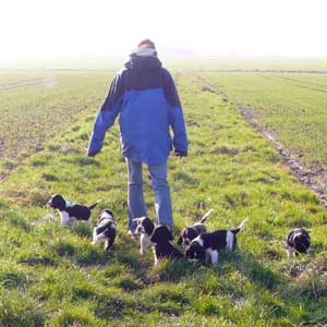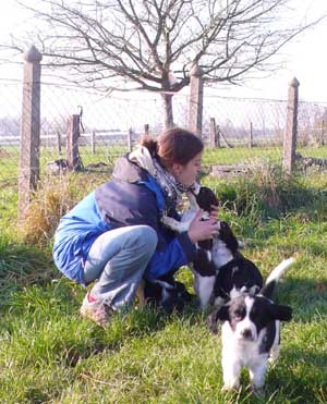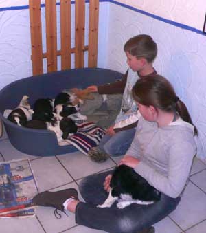 Der Durchfall ist Vergangenheit, alles ist wieder so wie es sein soll. Gestern Abend hatten die Welpen ein weiteres Mal Hundebesuch. Wer hier war, ist auf dieser Homepage zu sehen. Heute haben die Welpen ihrerseits einen Besuch gemacht. Eine kurze Autofahrt führte die C-chen und Mama Joy auf den Hof von Ursel einer zukünftigen Springerbesitzerin. In der Halle mit Stroh gab es viel zu entdecken und das Rennen und fallenlassen auf dem dicken Strohbett war eine reine Wonne. Viele Gerüche nach Pferd, Hund und Katze wurden untersucht und natürlich haben die Vorwitzigen sich auch schon ein Stück weit vom Rest des Rudels entfernt und den eingezäunten Hof erkundet- aaaaaaber nicht zu weit. Auf mein Rufen reagieren sie schon sehr sehr gut, und so kann man eigentlich problemlos die Meute beisammen halten. Zum Abschluß des Besuchs winkte mir Kaffee in der Küche und den Babies ein rotes Welpen-Traum-Sofa mit den allerschönsten Troddeln zum darunter Verstecken und hervorlugen, Troddeln fangen und rupfen. In der Küche drehten sie also noch einmal richtig auf bevor sie sich nach so viel Erlebtem zu unseren Füßen zusammenrollten und schliefen. Die Rückfahrt war diesmal wirklich erstaunlich ruhig denn so müde wie die C-chen waren reichte es nur für leises Winseln. |