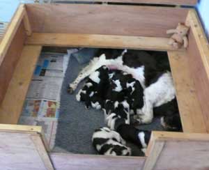 Die C-chen sind noch nicht einmal 48 Stunden alt und bestimmen schon den gesamten Tagesablauf. Sie benehmen sich altersgemäß, d.h. saugen und schlafen und saugen und schlafen. Das Saugen beherrschen sie so gut, dass ich heute schon auf der Waage bei allen eine Gewichtszunahme verzeichnen konnte- es ist doch immer sehr beruhigend das allabendliche Wiegen, dabei merkt man in den ersten Tagen die meisten Veränderungen. Ansonsten waren die ersten beiden Tage ausgefüllt mit Telefonaten, Post (vielen Dank für die vielen lieben Gratulations-e-mails!), jeder Menge zu waschender Wäsche, dem Umsorgen von Mama Joy und natürlich auch dem Rest des Rudels. Joy bekommt derzeit vier große Mahlzeiten am Tag und dementsprechend häufig muß ich sie auch entgegen ihrer natürlichen Lagerbindung aus der Wurfkiste komplimentieren damit sie draussen ihre nötigen Geschäfte verrichtet- erinnerte ich sie nicht daran, würde sie das wohl gerne vergessen. |