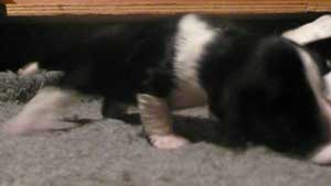 Ich habe mich nicht geirrt, der Wurf ist auf den Beinen! Als Ersten inflagranti erwischt habe ich -heute Morgen direkt nach dem Aufwachen- unseren Lütten Nr 4, der unverkennbar seine ersten Gehversuche machte (schlechtes Beweisfoto rechts). Aber auch schon kurz danach sah ich seinen großen Bruder Nr3 und seine Schwester Nr2 sich auf die Beine stemmen. Ob irgendjemand der drei vielleicht in der Nacht schon fröhlich erfolgreiche Versuche unternommen hat, kann ich nicht sagen, als erster gesehen wurde jedenfalls der kleine Muck. Ich bin sehr erstaunt, soviele Welpen des Wurfes zu diesem frühen Zeitpunkt schon auf den Beinen zu sehen, war es beim B-Wurf erst am 11. Tag lediglich Gwynn, die sich in der neuen Fortbewegungsmöglichkeit versuchte. |
