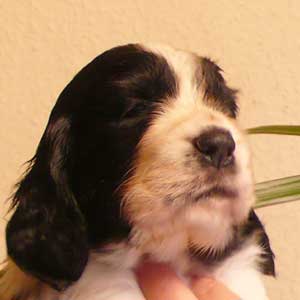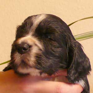 Mit dem Start in die dritte Lebenswoche befinden sich die Welpen jetzt in der sogenannten Übergangsphase, die Augen öffnen sich (Bild rechts Rüde Nr 6 bei dem man das Öffnen der Augen zuerst beobachten konnte, am 14. Tag) und auch die anderen Sinne erwachen. Ein vollständiges Sehen und Hören ist allerdings erst zum Ende der Übergangsphase, also zum Ende der dritten Woche zu erwarten. Die C-chen sind jetzt recht flink auf den Beinen und wenn Mama Joy in der Wurkiste zur Säuberung umherwandert wuselt ihr die Bande schon schnell um die Pfoten, um die Zitzen zu erreichen. Das klappt natürlich noch nicht bei der stehenden Hündin, aber einen Versuch wagen sie gern. Gestern zum 14tägigen Geburtstag startete die erste Entwurmungskur. Die Babies bekamen aus einer Pipette das Wurmmittel in die Mäulchen geträufelt. Das Gezappel auf dem Arm der Hilfsperson hielt sich in Grenzen, aber spucken konnten sie alle wie die Lamas :-) Beim "Geburtstagswiegen" konnte ich bei drei Welpen schon das kg verzeichnen. "Mr Big" (Rüde Nr 3) wird ja schon seit dem 11.Tag vierstellig geführt, seine braunen Schwestern überschritten die magische Grenze zwei Tage später. |