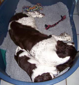 16.11.08 (4. Tag) Wachsen, dass es kracht Die E-spañas tun mir einen großen Gefallen, sie wachsen wie wild. Seit dem Geburtswiegen haben sie zwischen 220g und 270g zugelegt. Sie saugen und saugen und saugen... Mir bleibt nur mässig viel zu tun und so hebt sich auch meine Lagerbindung ;-) schon ein gutes Stück weit auf und wenn die Wurfkiste unter Frauchens Aufsicht ist wage ich mich auch schon hinaus in die Zivilisation d.h. auf zum Training. Nicht nur in dieser Beziehung ist unser derzeitiger zwei-Frauen-Haushalt eine Bereicherung. Auch Fine verlässt jetzt bereits ihre Bande für ein paar Minütchen, um im Eßzimmer mal "unter die Leute" zu kommen. Solange die Welpen keinen Muckser von sich geben hält Fine es ein Weilchen aus und kühlt ihr Gesäuge auf den Fliesen. Jedoch ein Pieps aus dem Lager und sie verlangt, dass man ihr die Türe öffnet. Fines Temperatur liegt an der oberen Grenze des Normbereichs und bietet mir keinen Grund zur Besorgnis. Gestern Abend hatte sie eine leichte Verhärtung in der Gesäugeleiste aber mit Kühlung per feuchtem Waschlappen die ihr sichtlich wohltat und mit gezieltem Anlegen der "Saugwunder-Rüden" ;-) war dieses Problem schnell behoben. Nova, Joy und Undis erhalten jetzt täglich mehrere Audienzen bei der Herrscherin des Wochenbetts und dies läuft wirklich problemlos ab. Noch nicht zu vorwitzig bleiben meine Mädels erstmal in gehörigem Abstand aus Respekt vor Fines Mutterschaft. Ein Knurren war noch nicht nötig, die Bannmeile bleibt gewahrt, auch wenn man seine Neugierde kaum zügeln kann. Gerade Undis möchte eigentlich noch viel mehr sehen von unseren neuen Rudelmitgliedern, aber auch sie weiß, dass die Zeit dafür noch nicht gekommen ist und diese Babies erstmal der Frau Mama allein gehören. 14.11.08 (2. Tag) Vorsicht ist besser als Nachsicht Nun ja, wir brauchten Zeit uns einzurichten. Am gestrigen Morgen wollte ich doch noch auf Nummer sicher gehen und fuhr mit Finchen zur Tierärztin die mir bestätigen sollte, dass alles in Ordnung ist und nicht doch ein nicht lebenstüchtiger Welpe in der Hündin verblieben ist. Dem war nicht so, ich hatte richtig gefühlt und so konnte Fine ganz aufgeregt zu ihren, per Wärmflasche gemütlich warm gehaltenen, Zwergen zurückkehren. Die Trennung ist nämlich ein grosser Stressor für die junge Hundemutter- der Urinstinkt der Lagerbindung verbietet ihr sich von ihren Welpen zu entfernen und sie muß auch zum Verrichten der Geschäfte mit sanftem Leinenzwang überredet werden. Seit heute geht dies schon ein wenig einfacher, aber in den ersten 24 Stunden ist es schon quälend für die Hündin, und umgehend nach Verrichten des Nötigsten dreht sie auf dem Absatz kehrt und ist nur schwer zu halten auf dem Rückweg in ihr Lager. Nach dem Tierarztbesuch kam anderer Besuch- meine "Hebamme" und der Welt beste Beraterin in allen Fragen rund um den Welpen. Seit dem A-Wurf hatte Annette alle Würfe direkt bei der Geburt begleitet, diesmal aus pädagogischen Gründen ;-) erst am Tag danach ein Auge auf die E-spañas geworfen- und auch sie war sehr angetan von meinen "Wonneproppen". Ansonsten verging der erste Tag, wie üblich mit Kommunikation -vielen Dank für die vielen lieben Glückwünsche ob per Mail oder Telefon- es ist oft überraschend wer alles mit uns mitgefiebert hat. Die Wurfmeldung fürs Zuchtbuchamt ist bereits versandbereit und somit stehen auch die ausgewählten Namen fest. Als Bildunterschriften zugeordnet zu den Einzelfotos der E-spañas kann man nun lesen auf welche Namen die Ahnentafeln der Welpen ausgestellt werden. Der Rest des Tages vergeht auch im Fluge mit Putzen, Wäsche und dem Umsorgen des Rests des Rudels. Meinen Mädels habe ich immer noch keinen Zutritt zum Wurfzimmer gewährt- nur heute einmal kurz einen Blick über die Türschwelle. Für Morgen ist jedoch eine Familienzusammenführung geplant. Die Überprüfung ob alles wunschgemäß verläuft zelebrieren wir immer am Abend: Das Wiegen der Welpen. Keines der E-spañas war zu müde von den Geburtsstrapazen- Alle nahmen bereits am ersten Tag tüchtig zu und auch das Wiegen heute Abend zeigte, dass die E-spañas ihrer derzeitigen Hauptaufgabe, nämlich Saugen, sehr gut nachkommen. Die Jungs wiegen bereits mehr als 600g und auch die Mädels haben ordentlich zugelegt. 12.11.08 (64. Tag) Happy Birthday Zunächst einmal der Status Quo: müde aber überglücklich. Das gilt für Finchen, Züchterin und Frauchen gleichermaßen. Bei den gerade geborenen E-spañas ist von Müdigkeit noch nicht die Rede die ohnehin schon strammen Bäuche schlagen sie sich voll, bisher ohne Unterlass mit nur ganz ganz kurzen Schlafpausen oft an der Zitze eingenickt. Schlaf, das Zauberwort woran es allen Zweibeinern hier am meisten mangelt, aber noch siegen die Endorphine über die Müdigkeit. Und Endorphine sind in Massen freigesetzt nach diesem schönen Geburtserlebnis und dem überzeugenden Resultat das gemütlich in der Wurfkiste vor sich hinnuckelt. Der Weg zu diesem Resultat wird im Folgenden beschrieben von dem Zeitpunkt an an dem die Informationen abrissen. Gestern gegen Mittag hatte ich mich nicht getäuscht um 12.30 Uhr war Finchens Körpertemperatur unter 37,0 grad gesunken, es war klar die Babies lassen uns nicht mehr viel länger warten, der erste Welpe müßte spätestens innerhalb der nächsten 24 Stunden das Licht der Welt erblicken. Froh, dass nun endlich ein "Zeitpunkt" feststand rechnete ich nicht damit, dass die Geburt der E-spañas tatsächlich die 24 Stunden Karenz einhalten würde. Von meinen vorherigen Würfen war ich ja gewohnt: Temperatur unten in der Früh=Geburt am Abend. Sehr zuversichtlich stellte ich mich also auf eine Nachtgeburt ein. Das Finchen hatte auch sichtlich schon zu tun in der Eröffnungsphase ganz anders als Mama und Oma war sie nicht die Ruhe selbst, sondern Hecheln, Zittern, Jammern, Scharren wechselten sich ab zwischendurch gab es jedoch auch immer wieder Phasen wo sie Ruhe hielt und schlief, aber auch im Schlaf z
