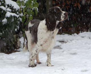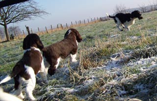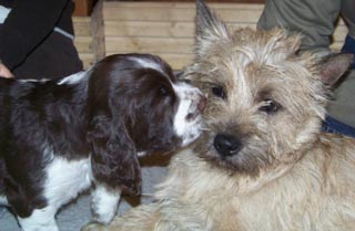 16.01.09 nicht viele Worte Neben Pearls Geschichten hier gibt es auch von den restlichen E-spañas noch einiges zu berichten. Poldy war schon mit im Revier und hat an etlichen Fährten ausgiebigst geschnuppert er läuft natürlich prima ohne Leine mit, etwas schwierig ist nur die Knabberei der spitzen Welpenzähnchen. Genau davon weiß auch Oskars Familie ihr Leid zu klagen- die tollen fünf Minuten wachsen sich auch schon mal aus und brauchen dringend strikte Grenzen. Ansonsten läuft auch hier das Zusammenleben gut, die Nächte sind ruhig und die Geschäfte werden bevorzugt im Garten erledigt. Was das "Puppybiting" angeht ersticke ich bei Pearl die Ansätze im Keim und sie kann ihre tollen fünf Minuten an Undis ausleben- da haben dann beide Spaß. Klein Amber habe ich ja nun schon zum dritten Mal gesehen- sie entwickelt sich prächtig, fühlt sich wohl im neuen Rudel und ist dort genau richtig -ihre Grenzen zeigen ihr eine hundeerfahrene Familie und die beiden Rudelchefinnen Jeanny und Tallulahbelle. Die versprochenen Videos von Pearls "Training" sind online: -Die Sache mit dem Napf 15.01.09 "Sitz+Bleib- pas de probleme" Ich bin immer wieder erstaunt wie viele Dinge Welpen im Rudel problemlos lernen einfach durch "ich mach´s genauso wie die Großen". Ich finde das Sporties-4-Generationen-Foto rechts, einfach das beste Beispiel für die Tatsache des Lernens am Modell. Viel wird mir also an Erziehungsarbeit von meinen Mädels abgenommen, aber weil es mir (und Pearl auch) soviel Spaß macht, lernt Pearl auch über die Alltagsstrukturen hinaus viele wichtige und unwichtige Dinge. Sie ist sehr clever und lernt schnell. z.B. aber vielleicht ist das auch genetisch von Fine weitergegeben das Apportieren des Futternapfs. :-) Heute nach der Morgenfütterung habe ich gesehen wie sie einen der Alunäpfe meiner Mädels in ihr Körbchen geschleppt hat. Das angebotenen Verhalten mußte ich dann heute Abend einfach nutzen und sehen, ob wir das nicht auch im Laufe der Zeit in geregelte Bahnen lenken können- wäre ja nett wenn jemand hinter den Mädels herräumt und dieser jemand bin mal nicht ich. ;-) . Morgen im Laufe des Tages gibt es dann ein Beweisvideo- es wartet darauf bei Youtube hochgeladen zu werden. Genauso wie noch einige andere Beweisvideos für "clever little girl"- Heute habe ich einfach mal unsere abendlichen Clickersessions gefilmt- lustig! Was sonst noch geschah in den letzten zwei Tagen. Pearl wird Begleithund: am Dienstag begleitete sie mich zur erweiterten Vorstandssitzung der Flotten Pfoten Soest e.V., um im Restaurant gemeinsam mit Schwesterchen Amber unter dem Tisch zu schlummern- Allerdings erst nachdem sie die Tasche von Ambers Frauchen auf links gedreht hatte. Gestern Abend begleitet sie mich zum Obediencetraining in der Reithalle- Uuuuui was war da viel los- und soooo viele kläffende Hunde- oooh und Warten in der Box gemeinsam mit Undis. Fremde Hunde hat Pearl dort nicht kennengelernt aus der Ferne angesehen schon, aber Kontaktaufnahme am "Arbeitsplatz" ist ein Verhalten, dass ich nicht bestärken will. Ich konzentriere sie also in solchen Situationen ganz auf mich und wir beide treiben lustige Spiele miteinander. 12.01.09 Terrier-Overflow :-) Zweieinhalb Tage ist Pearl jetzt schon Rudelmitglied und wir arrangieren uns super. Der tägliche Ablauf mit Fütterungen der Grossen und der Kleinen, Spaziergängen (Pearl begleitet uns jetzt im Rucksack auf meinen Bauch geschnallt und darf zwischendurch kurze Strecken mitwackeln), wer schläft wo und auch wie lange, und die Sache mit dem Pipi im Haus scheinen bereits geklärt. Bonnie die ansonsten mit Welpen erst nach dem Zahnwechsel gnädig verkehrt kommt auch mit Pearl zurecht, allerdings habe ich sie beide immer im Blick- Vorsicht ist besser als Nachsicht und ich mag die alte Lady nicht unnötig stressen. Die meiste Zeit versucht Pearl gar nicht die alte Dame zu kontakten mit der wohl nicht gut Kirschen essen ist- nur manchmal im Übermut des Spielens streift sie auch Bonnie um die Schnauze und dann muß ich eingreifen. Das reicht dann allerdings auch wieder bis zur nächsten exzessiven Spielphase. Gestern haben wir Welpensuite und Wohnung wieder in den Urzustand versetzt: Umzugsunternehmen Sporties&Co lässt grüßen. Dann haben wir uns auf den Weg nach Ahlen gemacht zunächst ein kurzes Training mit Undis und herumhoppeln auf dem tiefverschneiten Hundeplatz für Pearl danach ein Besuch bei den Camster Cairn`s - oh je arme Pearl, in der "Wurfstube" tummelten sich unzählbare 12 Terrier (davon ein Rieeeesen Airedaleterrier, ein Sheltie, der Camster Cairn´s O-Wurf und fünf Zweibeiner. Ganz ihrem Naturell entsprechend war Pearl zunächst zurückhaltend, sass unter meinem Stuhl und schaute sich das bunte Treiben in Ruhe an. Als dann klar war, wie welcher Hund einzuschätzen ist, von wem man sich lieber fern hält und wer schöne Spielaufforderungen macht, taute sie auf und erlag Pebbles Charme. Ein nettes Spiel mit dem jungen Airedaleterrier bahnte sich an und später steckte Pearl auch ihre Nase an das Gitter des Welpenauslaufs, um sich diese Mini-mini-mini-Ausgaben von Hund einmal anzusehen. Es dauerte nicht lange und dann schlief sie unter meinem Stuhl zusammengerollt in diesem Trubel ein. Am heutigen Tag blieb Pearl mit Joy und Undis in Küche und Schlafzimmer während ich zur Arbeit war. Wieder wurde ihr das Mittagessen von meinen Eltern gereicht und ich war ganz gespannt wieviele Pipiseen und/oder Häufchen ich bei meiner Rückkehr wohl finden würde- Nichts! Gar nichts. Nachmittags machten wir uns wieder auf auf unseren Spaziergang das erste Stück mit Pearl an der Leine geführt am Geschirr- das LeinenMakramee von vier Hunden plus Welpe war auch nicht viel schlimmer als sonst ;-) aber es ist schon schön wenn´s endlich heißt "Leinen los". Am Abend machen wir jetzt vor dem Abendessen unsere "Clickersessions" im Wohnzimmer. Pearl hat schon den Bogen ´raus- nach der anfänglichen Konditionierung der letzten Tage bot sie 