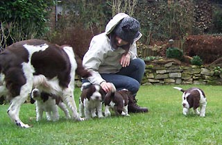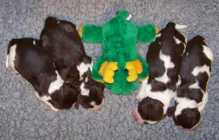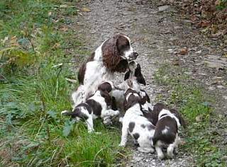 11.11.08 (63. Tag) 11.30 Uhr Finchens Temperatur ist jetzt auf dem bisherigen absoluten Tiefstwert von 37,1 Grad. Folgende Messungen werden zeigen ob die Temperatur weiter fällt oder ob es sich wieder nur um eine der größeren Schwankungen der letzten Tage handelt. Leichtes Muskelzittern war erstmalig zu beobachten und der Flamenco der E-spañas ist mittlerweile auch nicht nur zu fühlen sondern schon zu sehen. Ich würde mich freuen wenn es jetzt so langsam losginge, das Warten ist ganz schön zermürbend. Das erste Decken ist jetzt auf den Tag genau 9 Wochen her und der S-Wurf de los tres Robles ist genau neun Wochen alt. Auf den Fotos rechts kommt Humphrey der Vater der bei uns sehnlich erwarteten E-spañas seinen Sozialisierungspflichten nach. Es ist einfach nett wie er mit dem 10er Prachtwurf umgeht -es sind ja gar nicht seine Welpen aber das kümmert ihn nicht. Rudelnachwuchs gehört erzogen :-)