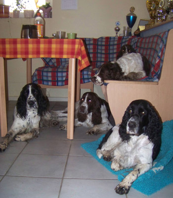 23.11.11 (Tag 53 nach dem 1. Decken) Da die offizielle Tragzeit von Hündinnen bei 63 Tagen liegt sind wir also am heutigen Tage beim Countdown angelangt. Die homöopathische Apotheke ist überprüft, das Calcium wartet auf seinen Einsatz, ebenso wie die Welpenwäsche und die Wurfprotokolle. Die Wurfkiste wartet noch geduldig darauf wieder aufgestellt zu werden und überhaupt warten wir alle mehr oder weniger geduldig. Amber hat jetzt einen Bauchumfang von 80 cm und trägt eine ganz ordentliche Last. Diesem Umstand ist geschuldet, dass wir jetzt lieber zwei kleinere Spaziergänge am Tag machen statt der großen "Gymnastikrunde". Ambers bevorzugter Aufenthaltsort im Moment ist unter dem Esstisch, ein Schelm der Böses dabei denkt. Natürlich hat sie weiterhin Hunger, sie hat ja auch eine Familie zu versorgen, aber bei mittlerweile drei Mahlzeiten am Tag sollte es den I-nsidern und ihrer Mama an nichts fehlen. Beim Handauflegen kann man ganz zarte Bewegungen der Zwerglein bereits gut fühlen. Wann wird es wohl soweit sein, dass wir sie auch sehen können? Wir werden morgen mit den Temperaturmessungen beginnen- leider muß nach 8 Jahren Dienstzeit ein neues Thermometer her, denn mein Dreamduo Cinco/Fame (wer genau ist leider nicht zu beweisen) hat sich in einem Anfall von wissenschaftlicher Neugierde über das alte Thermometer hergemacht. Da aber der/die Schuldige nicht gefunden werdem konnte, weiß ich nicht wem ich die Neuanschaffungskosten vom Taschengeld abziehen soll. Naja es trifft halt (völlig zurecht) immer den Erziehungsberechtigten. ;-)