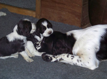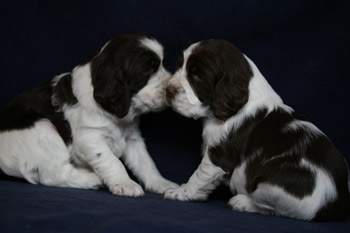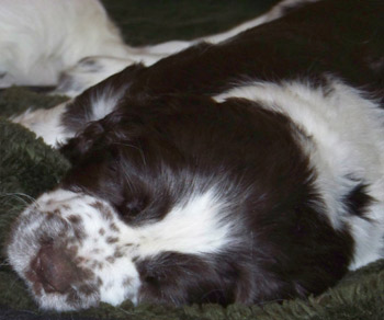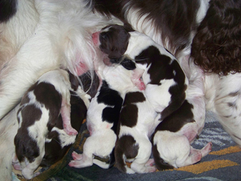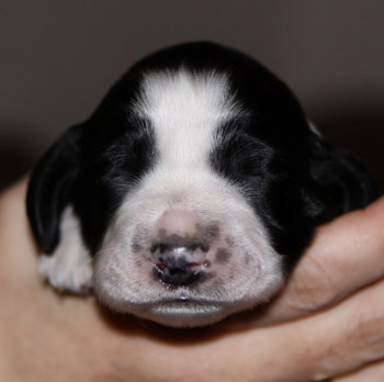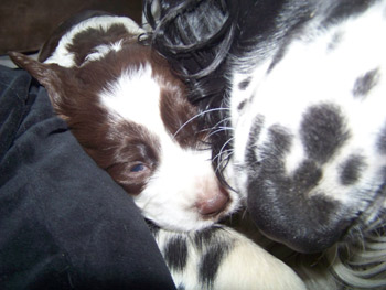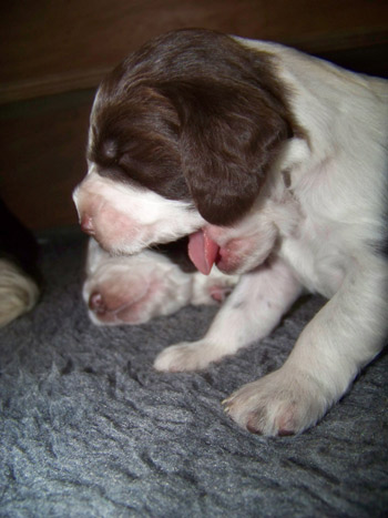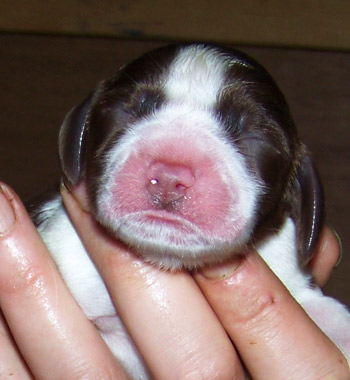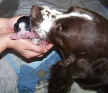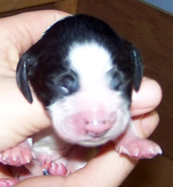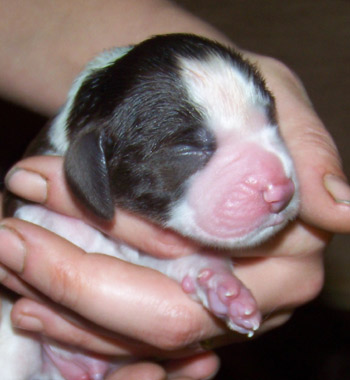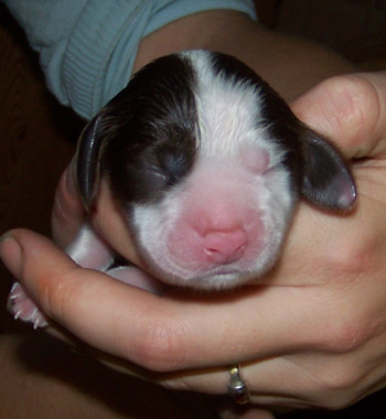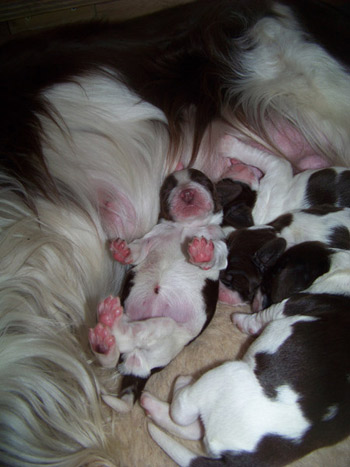 03.12.11 (Tag1) Die Insider sind noch nicht einmal 24 Stunden alt und die Marathongeburt ist noch sehr präsent. Nachdem wir jetzt 6 Stunden Schlaf bekommen haben, alle Vierbeiner gut versorgt sind, geht es jetzt an die Zusammenfassung der Ereignisse seit dem letzten Tagebucheintrag. Natalie hat neben diverser Handreichungen perfekt protokolliert und so fällt es dann leicht, auch die zeitlichen Abläufe zu rekonstruieren. Amber durfte mit Frauchens Genehmigung einen großen Teil der Eröffungsphase auf dem Sofa verbringen. Gegen 15.00 Uhr meinte sie jedoch es sei nun Zeit in die Wurfkiste zu gehen, und dort noch ein wenig die Laken zu malträtieren. Um 15.28 Uhr war die erste Presswehe zu sehen und wir waren so dankbar, dass die Zeit des Wartens vorbei war. Alle lähmende Müdigkeit war vergessen. Um 15.36 Uhr konnten wir schon den ersten Welpen in Empfang nehmen: Welpe 1: Hündin schwarz-weiß sie kam mit dem Mäulchen voran, war schon aus der Fruchtülle befreit und auch die Nabelschnur war bereits gerissen. Sie war von Beginn an sehr aktiv und wand sich beim Abtrocknen. Amber war auch sehr aktiv wußte sofort was zu tun ist und begrüßte ihre Erstgeborene mit fürsorglichem Putzen in der Welt. Die Waage zeigte 312 g für die "First Lady" der I-nsider. Die Hündin hat eine gleichmässige breite Blesse und einen gleichmässigen, breiten weißen Kragen auf der linken Körperhälfte ist sie durchgängig schwarz gefärbt, rechts ist der Brustkorb zur Hälfte schwarz. Ein weiteres Charakteristikum ist, dass sie am linken Hinterfuß bereits einen schwarzen Zehenballen hat. Es blieb genug Zeit diese Hündin gründlich zu versorgen, Fotos zu machen und sich zu freuen, denn Amber hatte es mit der Geburt von Nummer zwei nicht allzu eilig. Eine erste Presswehe um 16.14 Uhr kündigte diesen neuen Erdenbürger an. Um 16.21 Uhr rutschte Welpe zwei in die Welt. Welpe 2: Rüde braun-weiß von ihm sah man zuerst die Hinterpfötchen. Er kam in Hinterendlage, war auch bereits aus der Umhüllung befreit und die Nabelschnur schon durchgetrennt. Auch er ein kleiner aktiver Zappelphillip der sich am liebsten direkt auf den Weg zur Milchbar gemacht hätte. Amber freute sich sichtlich darüber jetzt ein zweites Kind putzen zu dürfen und nachdem der Herr für gut befunden wurde, wurde er gewogen. Er war 388g schwer. Seine Blesse ist nahezu gleichmässig. Er hat einen dreieckigen weißen Fleck im Nacken, einen unregelmässigen Kragen mit einem großen braunen Fleck darin. Auf der rechten Seite ist der Rippenkorb nur zur Hälfte braun. Sehr schnell wuselten er und seine Schwester umeinander an der Milchbar denn natürlich will man auch bei einer Auswahl von zwölf Zitzen gerade die Zitze, die schon durch das Geschwisterchen besetzt ist ;-) Ziemlich genau eine Stunde nach der Geburt des kleinen Jungen kündigte eine Presswehe um 17.22 Uhr das nächste große Ereignis an. Die Wehen kamen zunächst im 5 Minuten Abstand nach ca 40 Minuten Wehen wurden die Abstände dazwischen deutlich kleiner und um 18.09 Uhr kam kein leichtes Mädchen auf die Welt. Welpe 3 Hündin braun-weiß war schon beim Abtrocknen schwerer in der Hand. Sie kam "nackig" so wie ihre Geschwister und brachte nach der Versorgung sage und schreibe 412g auf die Waage. Ihre Blesse ist in diesem Wurf ein Unikat- ums Mäulchen gleichmässig weiß, jedoch nicht so hoch hinaufreichend der Stirnausläufer: ein niedliches Milchmäulchen. Auf der linken Seite ist der Rippenkorb vollständig braun gefärbt, rechts nur in der vorderen Hälfte braun. Sie hat einen gleichmässigen breiten weißen Kragen. Ruckzuck ging es nach dem Wiegen auf zur Milchbar. Ruhe senkte sich wieder über die Wurfkiste. Es wurden Unterlagen ausgetauscht und alles trocken gelegt, die Zwerge wieder und wieder begutachtet. An Ambers Bauch getastet war ich sehr unsicher, ob überhaupt noch ein Zwerg die Familie vervollständigen würde- einen meinte ich noch zu fühlen aber man kann ja nie ganz sicher sein. Es wurde eine lange lange Pause, um 18.54 Uhr ging die Presserei wieder los. Die Wehen kamen in großen Abständen. Da wir ja auch noch Nachgeburten erwarteten war die Spannung groß- eine Nachgeburt erschien um 19.29 Uhr. Danach wieder vollkommene Ruhe. So dass wir beschlossen zu Abend zu essen. Nach drei Gabeln Spaghetti: "Sie presst!" Teller weg, auf an die Wurfkiste und da war um 19.55 Uhr Welpe vier schon so gut wie angekommen. Welpe 4 Hündin braun-weiß Mit viel Schwung rutschte die kleine Madam mit den Hinterbeinen voran in die Wurfkiste- wie bereits gewohnt ohne Fruchthülle. Beim Abtrocknen saugte sie sich umgehend an Ambers Ohr fest.Sie wog genausoviel wie ihr Bruder: 388g . Auch ihre Blesse ist ein Unikat und etwas noch nie dagewesenes bei uns Sporties. Der Stirnausläufer reicht über das linke Auge hinweg. Sie hat einen vergleichsweise hohen Weißanteil am Körper, einen breiten weißen Kragen und auf der rechten Körperseite einen zusammenhängenden großen braunen Fleck, auf der linken Seite eine kleineren braunen Fleck. Ich meinte eventuell noch einen Zwerg fühlen zu können, in Ambers Bauch, war da aber sehr sehr unsicher ob das nicht eher Wunschdenken ist- es fehlte ja auf alle Fälle zum vollständigen Glück noch mindestens ein Rüde. Ziemlich genau 5 Stunden nach der allerersten Presswehe dieser Geburt kam dann die erste Presswehe die die Geburt des Welpen Nr 5 auf den Weg brachte um 20.27 Uhr. Welpe Nr 5 Rüde braun-weiß kam vollständig eingepackt um 20.50 Uhr auf die Welt. Der Welpe wurde ausgepackt, abgenabelt, abgetrocknet und ich wagte es kaum das Geschlecht zu kontrollieren. Jippie!!! Ein Junge! Die Waage zeigte ein Geburtsgewicht von 344g. Dieser junge Mann ist der Dunkelste im Wurf er hat eine nahezu geschlossene Decke mit weißem Fleck auf dem Rücken in H üfthöhe. Sein Kragen ist breit mit einem runden braunen Fleck im Nacken. Er hat eine sehr breite sehr symmertrische Blesse. Allerdings hat er einen leichten Knick in der Rute. Er gesellte sich um