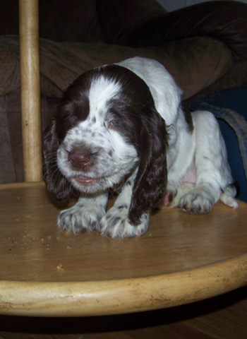 08.01.12 (Tag 37) So kann man auch mit kleinen Dingen, großen Welpen Freude bringen: derzeit haben die I-nsider großen Spaß daran auf einem umgedrehten Mülleimerdeckel zu balancieren und zu wippen. Vor allem Anton (Welpe 5) ist begeistert von dieser Möglichkeit seinen Gleichgewichtssinn zu beüben. Auch die untere Etage vom Beistelltisch wird gerne erobert, damit man sich die kleine Welt einmal von oben ansehen kann. Das Wetter und der Zustand des Gartens lud wieder nicht zu Freiausflügen ein, doch es wird Zeit für einen Tapetenwechsel und so sollen die Zwerge Sonntagnachmittag die Welpensuite draussen schon einmal kennen lernen. "Hui, aufregend, endlich etwas Neues!" Auch auf dem Speiseplan steht jetzt Abwechslung an: unter das Welpenfutter wird bei der Mittagsmahlzeit immer etwas Neues gemischt. Zum Beispiel Quark, Yoghurt, Frischkäse, Banane, Möhrenbrei oder auch mal Nudeln oder Reis, peppen das Mittagessen auf. Die Mahlzeiten werden aber, ungeachtet dessen, zu jeder Tageszeit bis auf den letzten Krümel verputzt. Jeden Abend gibt es nun als Betthupferl auch noch einen klitzekleinen Hundekeks, den die I-nsider allerdings eher als Lutscher denn als Zahnbürste ansehen. Mein erwachsenes Rudel genoß am Wochenende endlich einmal wieder lange Spaziergänge und Cinco hatte Samstag wieder Damenbesuch von der süßen Luise. Luises Frauchen Susanne und Gudrun vom Kennel Felicitous hatten noch Zeit, mir bei neuen Posing-Fotos der I-nsider zu helfen. Die Fotos sind jetzt hier.
