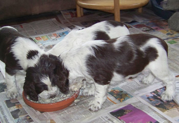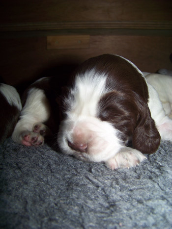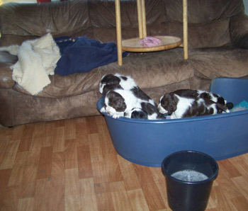 25.12.11 (Tag 23) Weihnachten legt eine kleine Pause ein, die gerade für ein kurzes Update reichen müßte. Die Zwerge haben jetzt in ihrer Wurfkiste ein Toiletteneckchen eingerichtet und nutzen es auch gern. D.h. ein Drittel der Kiste ist mit Zeitung ausgelegt, der Rest weiter mit kuscheligem Dry-bed, so dass Schlafzimmer und WC als getrennte Abteilungen wahrgenommen werden können. Auch die Wurfkistentür öffnet sich jetzt ein paar Mal am Tag und die Welplinge können die Welt auf der Veranda bestaunen. Zweimal am Tag gibt es jetzt Futter und das Benehmen am Napf wird durch Übung auch besser- will sagen, es befinden sich mittlerweile mehr Mäulchen als Pfoten im Futterbrei. Die Zwerge erkennen meine Stimme und besonders Hündin 4 wird ganz aufmerksam und aufgeregt sobald sie mich hört.