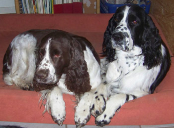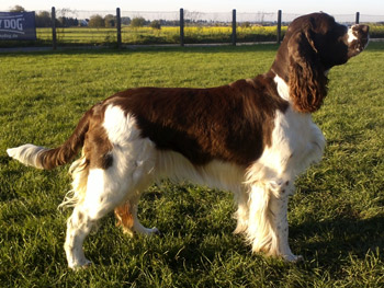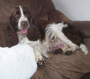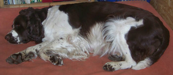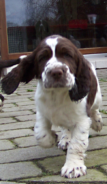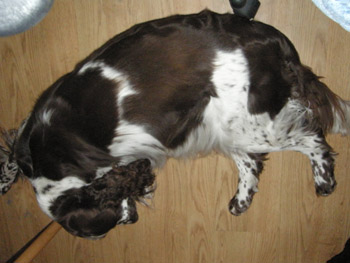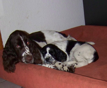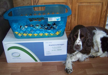 25.11.11 (Tag 55 nach dem 1. Decken) Alle Vorbereitungen sind nun abgeschlossen. Die Wurfkiste steht ausgewaschen und mit Ambers Decke bestückt bereit. Amber hat darin auch bereits "probegescharrt". Der liebliche Geruch von Sagrotan der für mich untrennbar mit Welpenzeit verbunden ist zieht durch den Kreisssaal. Amber ist ganz entspannt, schläft sehr viel, aber zur Futterzeit ist es aus mit der Ruhe: Fressen ist gaaaaaanz wichtig. Damit die Zwerge nach der Ankunft auch nicht Hunger leiden müssen hat Amber bereits vorgesorgt, Milch ist jetzt schon vorhanden. Auf den Spaziergängen lässt Amber sich hin und wieder auch noch einmal zu einigen Gallopphopsern hinreissen, wie man auf dem Youtube-Video hier sehen kann. Gerade kamen gute Nachrichten aus Spanien: Ambers Papa Humphrey wurde heute 8,5 jährig wieder einmal zur DOK Augenuntersuchung vorgestellt und ist weiterhin kerngesund.