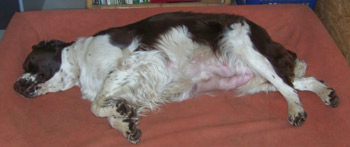 10.10.11 Selbstverständlich gibt es noch nicht viel Neues zu berichten. Amber vergisst ihre gute Erziehung und bettelt jetzt bei den Mahlzeiten am Tisch. Auch ihre Schwester Mocca (Bild rechts 7,5 Wochen tragend in DK) war eigentlich umgehend nach dem erfolgreichen Decken von Hunger getrieben, jetzt 8 Wochen später läuft dort schon der Countdown zur Geburt der Zwerge. Wir haben noch lange lange Wochen des Wartens vor uns, und denken in Etappenzielen. Jetzt heißt es erstmal warten auf den Ultraschalltermin am 28.10. um 16.00 Uhr. Die erste Woche nach dem Decken verging für mich jedenfalls wie im Fluge und ich möchte wetten, dass das jetzt so weiter geht bis Anfang Dezember.