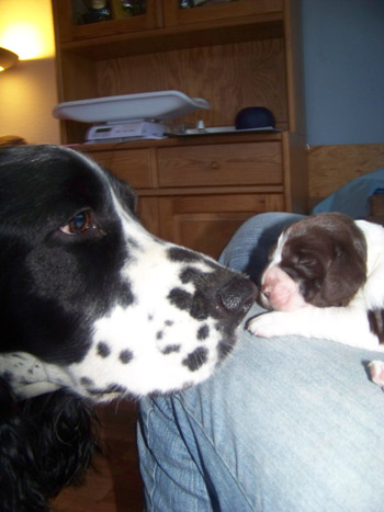 Weitere schöne Neuigkeiten betreffen den Rest des Rudels. Da Amber jetzt auch hin und wieder mal unter die Leute will ist die Klappe zur Babystation jetzt fast ständig geöffnet. Ohne deutliche Einladung kommt aber niemand hinein. Gestern Abend als Amber zum Säugen in der Wurfkiste lag, lud ich das Rudel ein, einen schnellen Blick auf die Zwerge zu werfen. Amber akzeptierte das ohne Stress, hatte jedoch ein wachsames Auge auf den Vorgang. So kam es dazu, dass Cinco Hündin3 und Rüde 2 einmal genau untersuchen konnte- ich glaube er ist sehr zufrieden mit seinen Kindern. Undis hielt einen respektvollen Abstand, und auch Fame war etwas befangen.