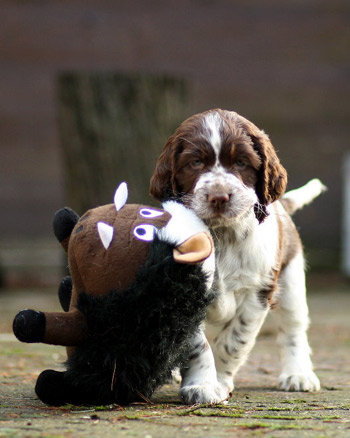 20.01.12 (Tag 49) Der Auslauf ist zu klein, die Rasselbande brauchte mehr Platz und bekam ihn auch. Der Rest des Büros, Esszimmer, Küche und Flur sind erobert in einem Affentempo. Ja, auch die braven I-nsider mutieren irgendwann zu kleinen Monstern vor denen nichts mehr sicher ist. Mit dem Klingelball am Band führt die ganze Meute sich auf wie eine Horde Terrier und es wird Zeit für mehr neue Erlebnisse. Heute ging es dann ungeachtet des Wetters über Mittag zum dritten Ausflug in den Wald. Glückliche Schlammschweinchen hatte ich hinterher im Auto, die nach der Trocknungsaktion ihr Mittagsessen noch verputzen, um dann in tiefen Schlaf zu fallen. Vor unserem Ausflug gelangen noch die Posing-Fotos mit 7 Wochen, dank Natalies Hilfe. Die Zwerge sind ihren jeweiligen Familien zugeordnet. Der Rufname in Gänsefüßchen hinter dem Kennelnamen gibt darüber Auskunft, wer zu wem gehört. Posingfotos HIER