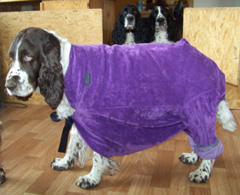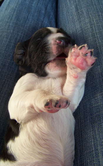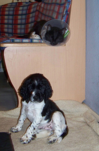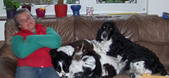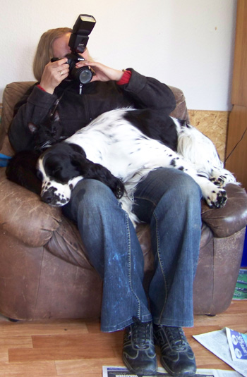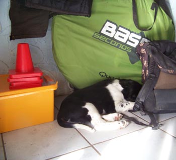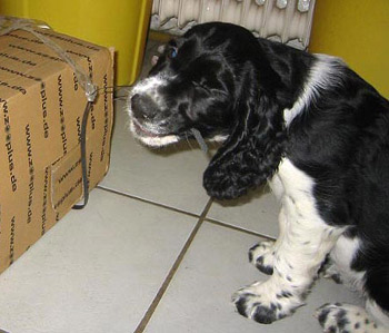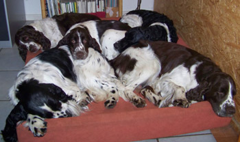16.05.12 (Tag 62) Auch Capper ist nun abgereist- wie man auf dem Foto sieht hat er sich bereits am Montag eingestimmt auf das Zigeunerleben, dass er mit Birgit, Uncas und Laurin führen wird. Eine Kiste mit Obedienceuntensilien, ein Rucksack voller Dummys und die Möglichkeit in vielen Teilen Deutschlands zu Prüfungen und Seminaren die Zelte aufzuschlagen- was will man mehr, um ruhig zu schlafen? Das untere Bild bringt meine Hoffnung auf ein harmonisches betuliches Zusammenleben mit einem fünfblättrigen Kleeblatt zum Ausdruck. Nike weiß, mit wem man sich gut stellen muß bei uns, bzw sie geht erstmal den Weg des geringsten Widerstandes ;-). In 15 Stunden sind wir hier wieder ein normales Rudel, dass im Welpentagebuch nichts mehr zu berichten hat, wenn Juicy auf dem Weg nach Hamburg ist. Ich schliesse jetzt hier das J-Wurf Tagebuch. Um die Zeit Heute vor neun Wochen war ich ähnlich müde und zermürbt durch Wartezeit auf die J-ustDoIts, jetzt bin ich müde und zermürbt durch die anstrengende Welpenaufzuchtzeit. So schön und unvergleichlich es immer wieder ist, so anstrengend ist es auch, und wir alle gehen auf dem Zahnfleisch wenn sich die gemeinsame Welpenzeit dem Ende zuneigt. Betulich wird es wohl auch in Zukunft nicht werden mit drei Springern in Saft und Kraft, einem Pubertisten-Azubi und einem Zwergen-Azubi. Wir brauchen jetzt einfach Zeit uns zu finden, zu erinnern warum man sich diese ganze Arbeit antut und für wen eigentlich genau. darum sehen wir den vierbeinigen Sporties-Kindern in Ruhe beim Wachsen zu und schauen was andere Kennels in der Zwischenzeit auf die Beine stellen.