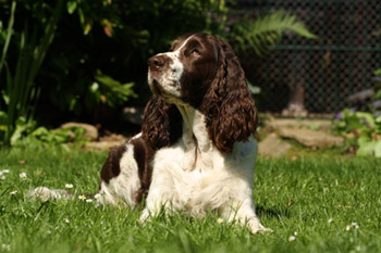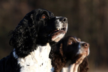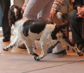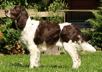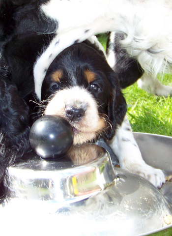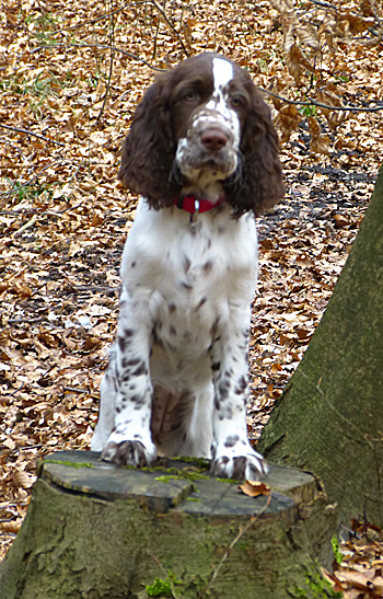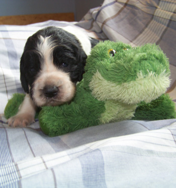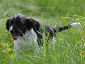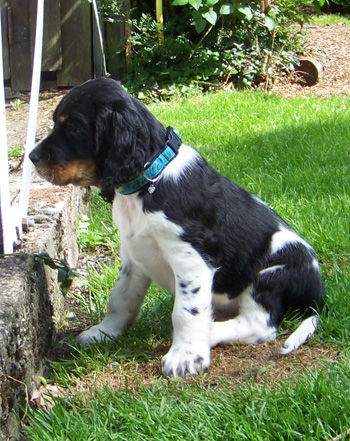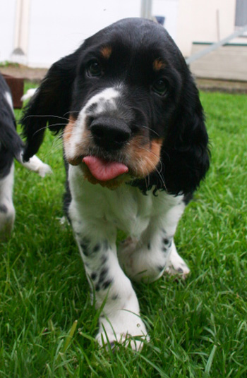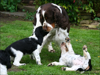 15.04.12 (Tag 31) Nach einem wunderschönen Dummytraining von Fame und Joy gestern, hatten die Zwerge wieder neuen und alten Besuch. Geplant war ein erster kurzer Ausflug in den Garten für die J-ustDoIts und wir liessen uns von gelegentlichen Schauern nicht abhalten. Fünf erwachsene Springer, sechs Babyspringer und vier Zweibeiner drubbelten sich auf der überdachten Terasse vor der Welpensuite in der Hoffnung möglichst wenig Regentropfen abzubekommen. Obwohl der "Ausflug" keine zehn Minuten dauerte fielen die Zwerge danach umgehend in Tiefschlaf. Naja man muß ja auch eine Masse neuer Eindrücke verarbeiten. Ein paar wirklich wenige Fotos in der Galerie zeugen von dem Ausflug und die Fotoausbeute von gestern untermauert meine Theorie, dass es eben doch manchmal an der Badehose liegt wenn der Bauer nicht schwimmen kann. ;-)