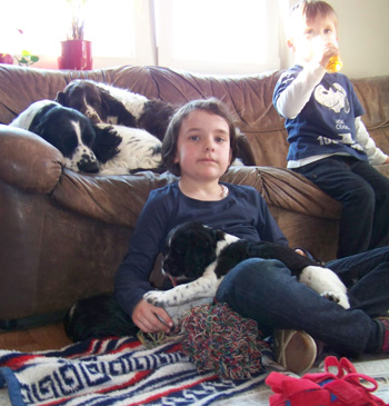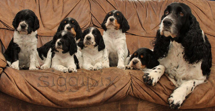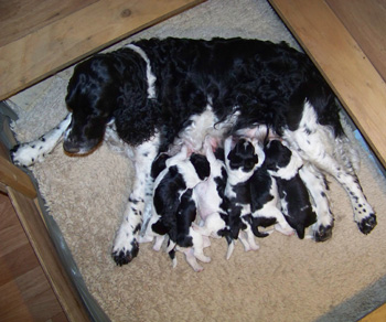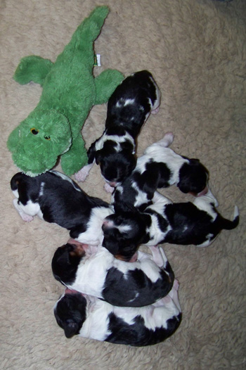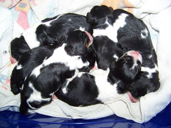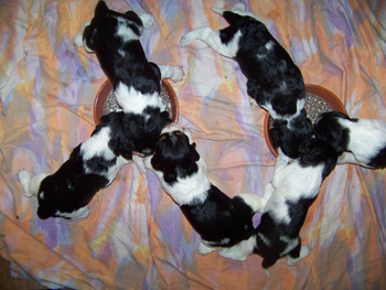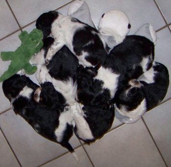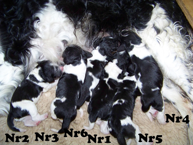 | Der J-Wurf ist geboren am 15.03.12 es sind zwei Rüden und vier Hündinnen in den Farben schwarz-weiss und schwarz-weiss mit Loh. |