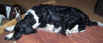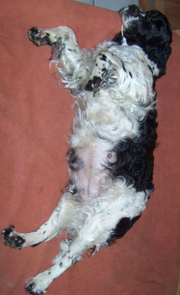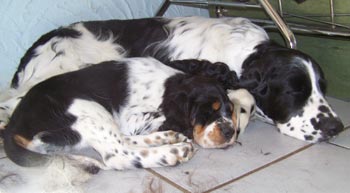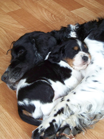14.03.12 (64. Tag) 16.30 Uhr Diese quälende Warterei... Die Körpertemperatur ist nochmal ein Quäntchen gefallen auf 36,9. Muskelzittern, Unruhe, Pusten, Hecheln Scharren wechseln sich ab. Undis will auch sehr häufig in den Garten und setzt dort jedes mal ein klein wenig Kot ab, um dann wieder hineinzustürmen. Der Versuch eines Mittagsschlafes ist kläglich gescheitert. Kaffee muß jetzt helfen. Das Mittagsmahl für uns bestand aus belegten Brötchen und Kuchen an dem Undis doch gesteigertes Interesse hatte. Ihr eigenes Mittagsmahl dauerte diesmal noch länger, aber tapfer würgte sie alles hinunter. Spaniel eben ;-) 12.00 Uhr Die Eröffnungsphase ist in vollem Gange. Der Warten-Endspurt ist eingeleitet. Wann nun tatsächlich Zwerg Nr 1 das Licht der Welt erblickt steht noch in den Sternen. Undis ist unruhig, zittert oder hechelt, scharrt hin und wieder und immer wenn die Eröffnungswehen nachlassen schläft sie eine Weile. Braves Mädchen! 06.45 Uhr Zweieinhalb aufregende Stunden haben wir schon hinter uns. Um 04.15. war ich hellwach. Undis war über Nacht unruhig. Die erste Messung direkt nach dem Aufstehen zeigte 37,1 Grad -vielversprechend. Undis war auch deutlich unruhig, hechelte und leckte. Ich war recht sicher, dass dies den Beginn der Eröffnungsphase markiert. Undis wurde auch zunächst nicht ruhiger, aber die nächste Messung eine Stunde später zeigte dann schon wieder 37,3. Dafür gibt es zwei wahrscheinliche Erklärungen: entweder war die Temperatur in der Nacht schon tiefer und steigt bereits wieder, oder es sind die üblichen Schwankungen. Das Frühstück schmeckte Undis noch, aber das ist ja bei ihr nicht ungewöhnlich. ausgiebiges Scharren im Sofa und Hecheln konnte ich bis 06.00 Uhr beobachten. Jetzt grade schläft sie an Cinco und Fame gekuschelt.