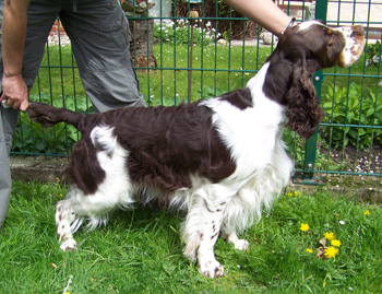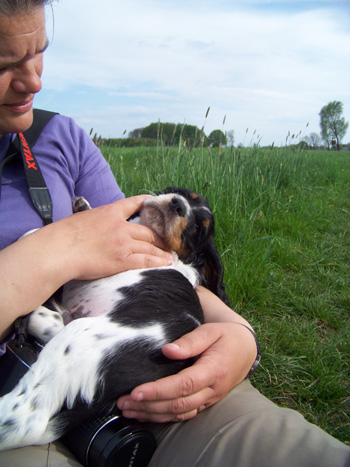 05.05.12 (Tag 51) Am 7 Wochen Geburtstag gab es für die J-ustDoIts Besuch von Heinz, Heike und Coffee. Heinz hat unter anderem schöne Fotos gemacht vom "Vatertag" Pommes war sehr geduldig mit seinen Nachkömmlingen: Bilder in Heinz Galerie ab HIER. natürlich mußte auch ein allerletztes Foto-posing sein. Die Stand und Sitzbilder mit den vergebenen Namen sind jetzt auf der Bilderseite des J-Wurfs. Der Stallbesuch inclusive Strohschüttenparty hat auch schon stattgefunden- jedoch war meine Kamera zu Hause geblieben- sie hätte eh keine Chnace gehabt bei wieselflinken Welpen im Dämmerlicht der Scheune. Die letzte Wurmkur hier ist geschluckt als kleines Leberwurstpaket und die Zwerge wiegen zum Großteil deutlich über 5 kg. 02.05.12 (Tag 48) "Jetzt sind wir schon waschechte Zigeuner-Spaniels." Der erste Ausflug fand vorgestern statt und war wie üblich die kurze Fahrt zur Hochsitzstrecke. Ganz tapfer wackelten die J-ustDoIts durch das hohe Gras, mit Mama und den Zweibeinern im Schlepptau. Heute waren wir dann im Gesamtrudel bei Andrea mit Flake. Den ganzen Nachmittag haben die Zwerge dort von den üblichen Schlafphasen unterbrochen den Garten untersucht, die Abendmahlzeit dort eingenommen und zuguterletzt ein ganz lautes Gewitter bei geöffneter Terassentür miterlebt. Da sich aber von den Großen, die mittendrin lagen, niemand aufregte war auch für die Zwerge das Gewitter nicht der Rede wert. Beim ersten lauten Donnergrummeln erschrak Hündin Nr1 und suchte sich ein Plätzchen näher bei Mami- Hündin Nr 5 lief zur geöffneten Tür, um sich das Spektakel einmal näher zu besehen. Fotos von den Wandertagen in der Galerie. Zwischen den Ausflügen hatten wir recht viel Besuch, Juicys Familie war noch einmal da und freut sich sehr, nun zu wissen, welches kleine Mäuschen bald ihr Leben bereichert. Gestern waren Dallas und Ilka mit ihren Leuten hier zum Friseurtermin und Klönschnack, während Ulrike und ihre Jungs wieder abgereist sind und von mir hier nun vermisst werden. Naja und eben auch Cinco hatte zweimal Besuch- es ist unfassbar was so alles in die Zeit zwischen Sonnenaufgang und 24.00 Uhr passt... Wobei es eben auch unglaublich ist, was alles NICHT mehr passt- aber man muß Prioritäten setzen: wichtig ist, was wedelt!