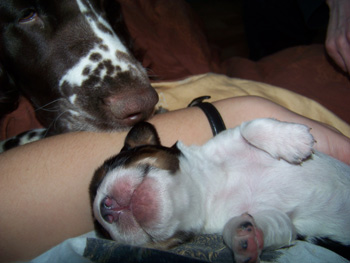 21.03.12 (Tag 6) Alles geht hier seinen Gang und die Abläufe haben sich eingespielt. Die J-ustDoIts sind bedeutend ruhiger und zufriedener geworden, ebenso Undis. Ihre Lagerbindung lässt etwas nach, und sie kühlt sich vor der Wurfkiste liegend gerne einmal ab. Auch auf die täglichen Spaziergänge begleitet sie uns schon wieder. Ich selbst habe endlich mal wieder mehr als vier Stunden am Stück geschlafen. Das tut gut. Die Zwerge nehmen zu, der eine mehr, der andere weniger. Etwas unzufrieden macht mich die Zunahme von Hündin 1- Das mußte ich mir genauer ansehen, aber heute früh waren es dann erstmals 40g Zunahme bei ihr, so soll das jetzt bleiben. Heute gibt es ein paar neue Fotos in der Galerie. Auch von Lennox und Sunny gibt es neue Bilder in der I-nsider-Galerie. Mir wird vom gestarteten Zahnwechsel berichtet. Spannend!