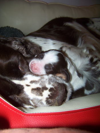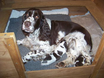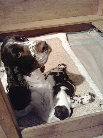 Dringend war es nötig, dass Lara getrimmt wurde. Ich bat Nina Kerkhof (Schul-Springer) um Hilfe, weil ich weiß, dass ihre Springer immer sehr gut aussehen, und sie selber trimmt, außerdem ist ein Nachmittag mit Nina immer sehr kurzweilig ;-). Also reiste sie gestern an und wir stellten Lara auf den Trimmtisch, die ließ sich das wie immer gern gefallen. Die anderen Hunde wuselten zunächst um uns herum, nur irgendwann im Laufe der Zeit war Fame verschwunden. Ich rollerte ins Schlafzimmer und da bot sich mir der Anblick vom Foto rechts. Fame hat die Gunst der Stunde genutzt um endlich die Neuzugänge näher kennenlernen zu können. Lara lässt Fame nämlich immer noch nicht an ihre Töchter. Fame blieb eine Weile selig als Babysitterin in der Wurfkiste, aberwir komplimentierten sie heraus bevor wir Lara vom Tisch entließen, denn man muß ja keinen handfesten Krach heraufbeschwören.