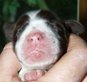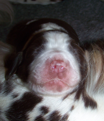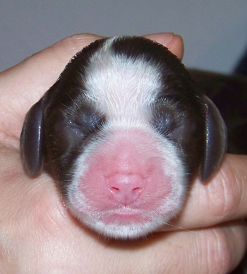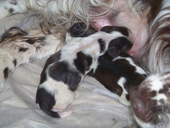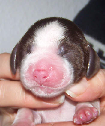 Ursel als Geburtshelferin gönnte mir ab 20.00 Uhr drei Stunden Schlaf und weckte mich um 23.00 Uhr als bei Lara nach einem Gassigang Fruchtwasser abging. Ab da waren wir alle hellwach und auch Hannes gesellte sich zu uns. Warten mußten wir trotzdem noch eine lange Weile: um 00.30 kam die erste heißersehnte Presswehe. Vier Presswehen später um 00.36 Uhr war unser erstes Mädchen mit den Hinterpfötchen zuerst bereits in der Wurfkiste gelandet. Ursel hatte nicht viel zu tun- Madame hatte ihre Fruchthüllen bereits abgestreift und Lara erledigte das Abnabeln perfekt. Nach dem Trockenrubbeln auf die Waage gebracht verzeichnete die große Schwester 350g und war um 00.45 bereits an der Milchbar angedockt.