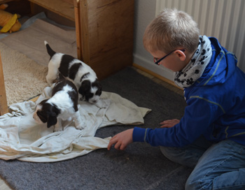 Nachdem den N-iñas nun Welpenspielzeug zur Verfügung steht und sie das auch gern begutachten und nutzen hat Lara ihren sehr persönlichen Teil dazu beigetragen. Lara ist nun ständig auf Beutezug gewesen um Hannes Socken und Unterwäsche zu den Töchtern zu tragen. Offensichtlich ist das ihre Vorstellung von pädagogisch wertvollem Spielzeug für Springerwelpen.