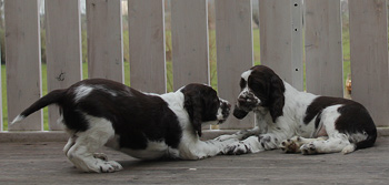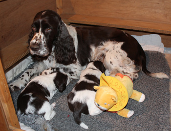 Wenn ich Rat suche, habe ich zwei sehr gute überaus erfahrene Ansprechpartner. Eine davon ist Elena Stöhr von den "des los Tres Robles" -Springern. Elena züchtet seit über 20 Jahren Springer und seit 2008 gibt es eine sehr gute Zusammenarbeit zwischen uns und ich nutze immer wieder gern Rüden aus ihrem Kennel als Väter für meine Würfe, denn das spanische Blut ist sowohl von meiner Gründerlinie (aus Lerchenwald und damit jede Menge Hightide´s-Finnland) als auch von der norwegischen Undislinie meilenweit entfernt. Elena hat durch ihre interessanten Anpaarungen in ihren jetzigen Zuchthunden hauptsächlich alte britische Gene aber sehr erfolgreich auch Schweden berücksichtigt. Ihre Hunde vereinen Gesundheit, Arbeitseifer, Lernwille und Showtyp auf sehr attraktive Weise und so ist es nur selbstverständlich für mich, auf diese interessanten Linien zurückzugreifen.