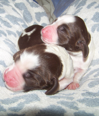 Um 02.12 protokollierte Hannes den ersten Abgang von Fruchtwasser, wir entschieden uns zu einem Zwischensnack mit belegten Brötchen denn beim ersten Welpen hatte es ab Wasserabgang ja auch noch ein Weilchen gedauert. Ursel konnte jedoch ihr Brötchen nicht ganz aufessen. Um 02.28 begann eine Reihe von wieder vier Presswehen und zehn Minuten später um 02.38 Uhr lag unsere Nummer zwei ebenfalls eine braune Hündin von Lara abgenabelt im Wurflager. Sie brachte 316g auf die Waage. Obwohl Lara schön abgenabelt hatte begann diese Hündin jedoch noch einmal aus dem Nabel zu bluten und ich setzte kurzfristig eine Klemme an. Mit der Klemme kann man natürlich nicht zur Milchbar sondern bleibt ins Handtuch gewickelt und so dauerte es ein paar Minuten länger bis die kleine Schwester um 02.53 ihren ersten Schluck nahm.