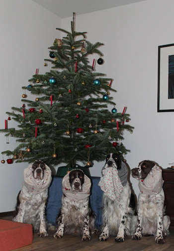 und weiterhin gibt es Geschenke. Erst kam ein Paket mit Leckereien und Spielzeug von SS Karmella und Ulrike und ihre drei Sporties-Jungs brachten uns das Luxuskörbi mit. Lara findet es klasse. Wir feiern heute Silvester also mit sieben Springern ganz in Ruhe, mit hoffentlich wenig Knallerei von den Nachbarn gegenüber.