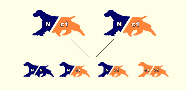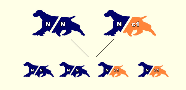Aus dieser Verpaarung entsehen statistisch gesehen 50% cord1 normal Nachkommen und 50 % cord1 Träger. Keiner der Welpen wird jemals an cord1 erkranken, jedoch ist es keinesfalls ausgeschlossen, dass Welpen aus dieser Verbindung an einer Form der PRA erkranken für die es noch keinen Gentest gibt. |