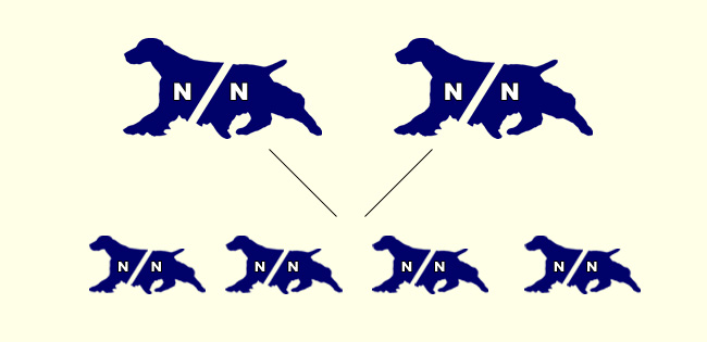 Es können aus dieser Verpaarung nur weitere cord1 normale Nachkommen enstehen. Keiner der Welpen wird jemals an cord1 erkranken, jedoch ist es keinesfalls ausgeschlossen, dass Welpen aus dieser Verbindung an einer Form der PRA erkranken für die es noch keinen Gentest gibt. |