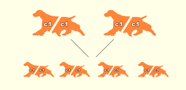 Alle Nachkommen aus dieser Verpaarung tragen das rezessive cord1 Gen doppelt und können eventuell im späteren Leben die Krankheit ausbilden. Darüberhinaus können auch diese Nachkommen an weiteren PRA Formen erkranken für die es heute noch keinen Gentest gibt. |